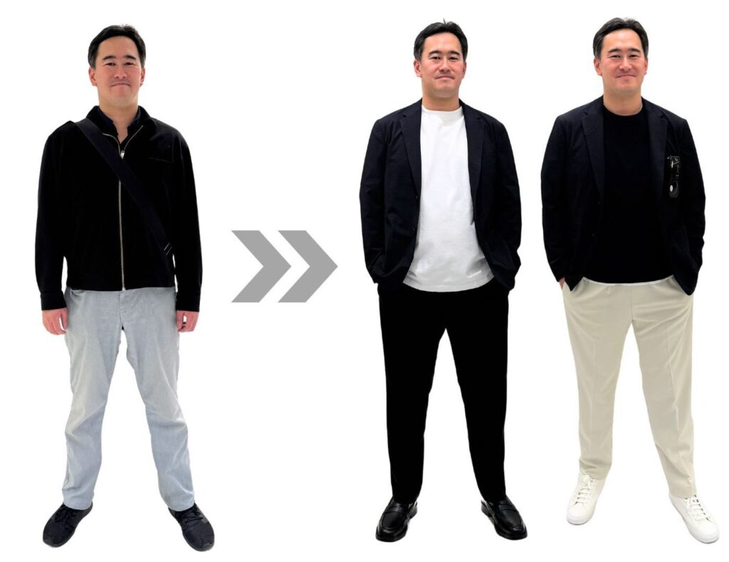 若い頃から服選びがわからず、何を着たらカッコよく見えるか、外見の印象をよくしたいとずっと思っていたので、スタイリストさんにコーディネートしてもらうことは昔からの夢だったので、先生に依頼することができ念願の夢が叶いました!